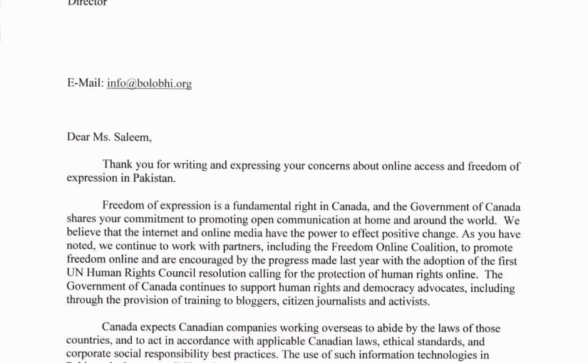 Thurday, 5 Sept, 2013: Government of Canada responded to our letter, sent on the 23rd of July 2013, which raised the issue of Netsweeper, a Canadian company, that sells technology for content filtration on the internet (allegedly to the Pakistan government). Our letter urged the Canadian Government to fulfill their commitments, to stand by the … Continue reading Canadian Government Responds To Netsweeper’s Presence In Pakistan